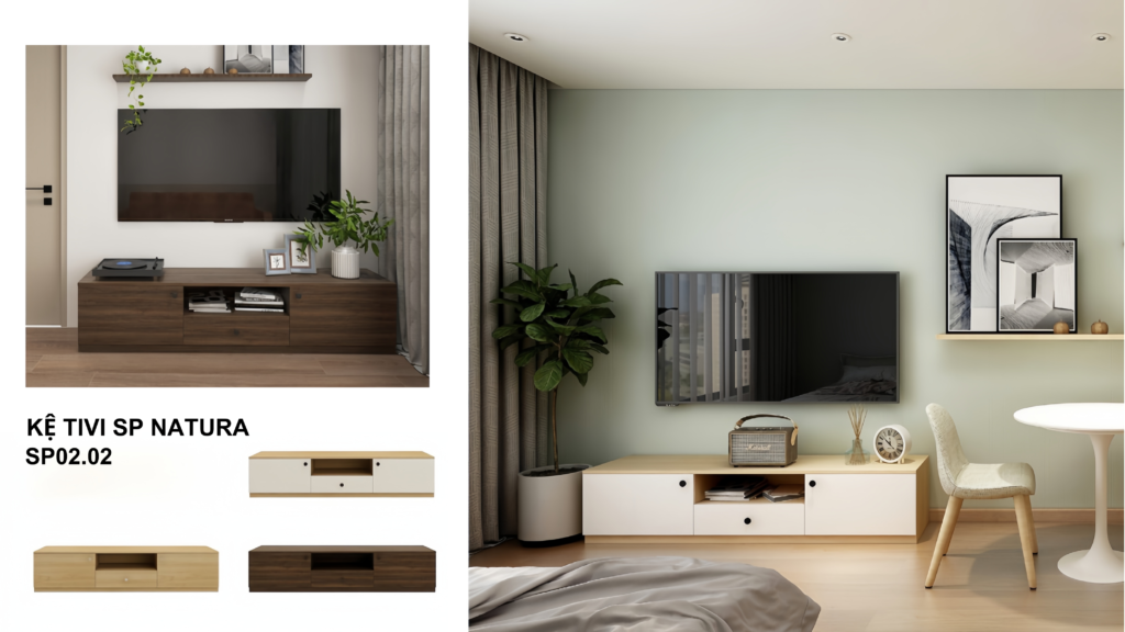 Kệ tivi thường được thiết kế với các thành phần chính như mặt kệ, ngăn chứa, và hộc tủ, giúp tối ưu hóa công năng sử dụng. Chức năng chính của kệ là đặt tivi và lưu trữ các phụ kiện liên quan như đầu thu, điều khiển, loa hay thiết bị giải trí. Bên cạnh đó, kệ tivi còn có thể trở thành điểm nhấn trang trí, nơi trưng bày sách, đồ trang trí hoặc chứa các vật dụng tiện ích khác, góp phần tạo nên không gian sống gọn gàng và tinh tế.
